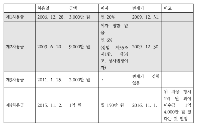 ⑷ 위 변제 당시 제1, 2차용금의 원금 소멸시효는 완성되지 않은 상태(원심판결에 따르면, 원심은 2015. 11. 2. 차용 당시 채무자가 차용증에 제1, 2차용금 원금 기재함으로써 채무승인 및 시효이익 포기했다고 인정. 이 점은 상고심에서 다투어지지 않음), 이자 소멸시효는 완성된 상태