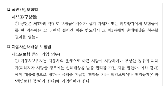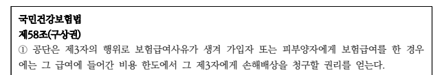 ❏ 헌법재판소 2012. 5. 31. 선고 2011헌바127 전원재판부 결정 : 이 사건 법률조항은 피해자인 가입자 또는 피부양자에게 신속한 치료가 이루어질 수 있도록 공단이 먼저 보험급여를 실시하여 피해자의 건강보험수급권을 우선적으로 보장하는 한편, 가해자의 손해배상 전에 보험급여가 이루어져서 발생하게 되는 복잡한 권리․의무 관계를 간결하게 하여 민사법의 기본원리인 과실책임원칙을 달성하고, 구상권 행사를 통하여 건강보험 재정의 건전성을 유지하는 것을 목적으로 한다.