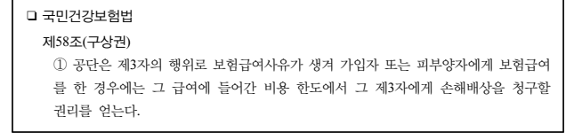 국민건강보험법 제58조에는 공단의 보험재정을 확보하려는 취지도 포함되어 있으나 국민건강보험법의 입법 취지와 국민건강보험제도의 사회보장적 성격에 비추어 보험재정의 확보가 수급권자인 피해자의 이익보다 반드시 우선한다고 볼 수 없음