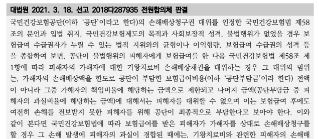 ☞ 위 판례 중 보험급여액 전부에 관하여 손해배상채권을 대위할 수 있다는 부분은 대법원 2021. 3. 18. 선고 2018다287935 전원합의체 판결에 의하여 변경되었음(위 대법원 2015다 231504 판결은 “피해자의 과실 등을 고려하여 산정된 손해배상채권의 범위 내에서 보험 급여액 전부에 관하여”라고 판시하였지만, 이번 판결은 “피해자의 과실 등을 고려하여 산정된 손해배상채권의 범위 내에서 보험급여액 중 가해자의 책임비율에 해당하는 금액에 관하여”라고 판시하고 있음)