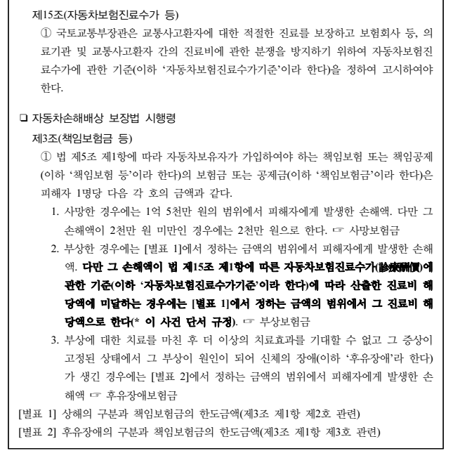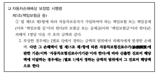 대법원은 자동차손배법 시행령 제3조 제1항 제2호 본문과 단서의 의미에 관하여, “피해자가 부상한 경우 ① 손해액이 자동차손배법 시행령의 [별표 1]에서 정한 금액을 초과하는 때에는 [별표 1]에서 정한 금액을, ② 손해액이 [별표 1]에서 정한 금액에 미달하는 때에는 손해액을 각각 책임보험금으로 하되, ③ ‘부상으로 인한 손해액’이 자동차보험진료수가기준에 따라 산출한 진료비 해당액에조차 미달하는 때에는 ‘진료비 해당액’을 부상으로 인한 책임보험금으로 한다는 뜻이다.”라고 한다[대법원 2010. 7. 8. 선고 2010다2862 판결(부상으로 인한 손해액이 진료비 해당액보다 많으므로 이 사건 단 서 규정이 적용된다고 볼 수 없는데도, 이 사건 단서 규정을 적용한 원심을 파기한 사례) 등].