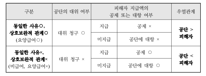 상호보완적 관계의 유무에 따른 ① 공단의 대위 범위와 ② 대위되는 손해배상청구 또는 책임보험금청구에 대한 공제 또는 대항의 범위를 정리하면 다음 표와 같다.