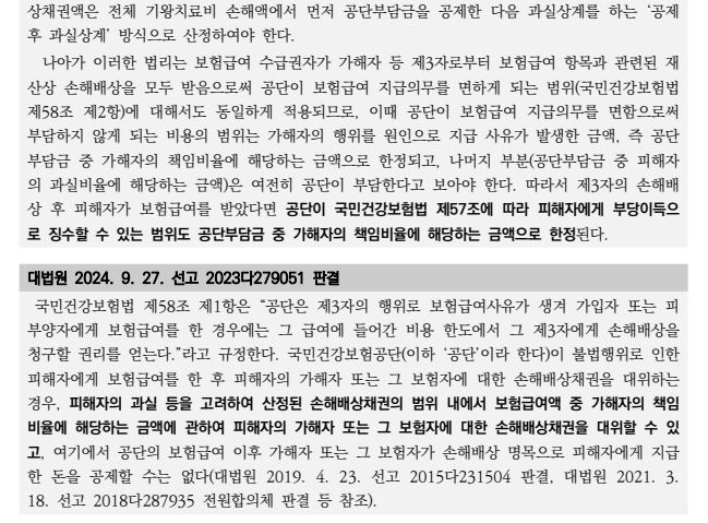 ⑷ 대상판결(대법원 2024. 7. 11. 선고 2021다305437 판결)은 사회보험으로서의 건강보험의 지속가능성과 피해자에 대한 보호 사이의 가치를 형량하여 상호보완적 관계를 기준으로 ‘공단우선설’에 관한 적용 범위를 명시하였다는 점에서 그 의의가 있다.