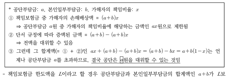 즉 자동차손배법 시행령 제3조 제1항 제2호의 책임보험금은 원칙적으로 손해액과 일치하지만(➊ 유형), 손해액이 책임보험금 한도금액을 초과하는 경우(➋-1, 2, 3 유형) 그 한도금액이 책임보험금이 된다(= 유한책임). 이러한 경우에는 이 사건 단서 규정 이 적용될 수 없다(대법원 2010. 7. 8. 선고 2010다2862 판결 등).