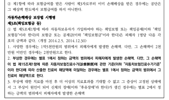 ① 피해자의 상해 정도가 자동차손배법 시행령 제3조 제1항 제2호에 따라 규정된 [별표 1]의 어디에 해당하는지를 살펴 그 책임보험금의 한도를 확정함