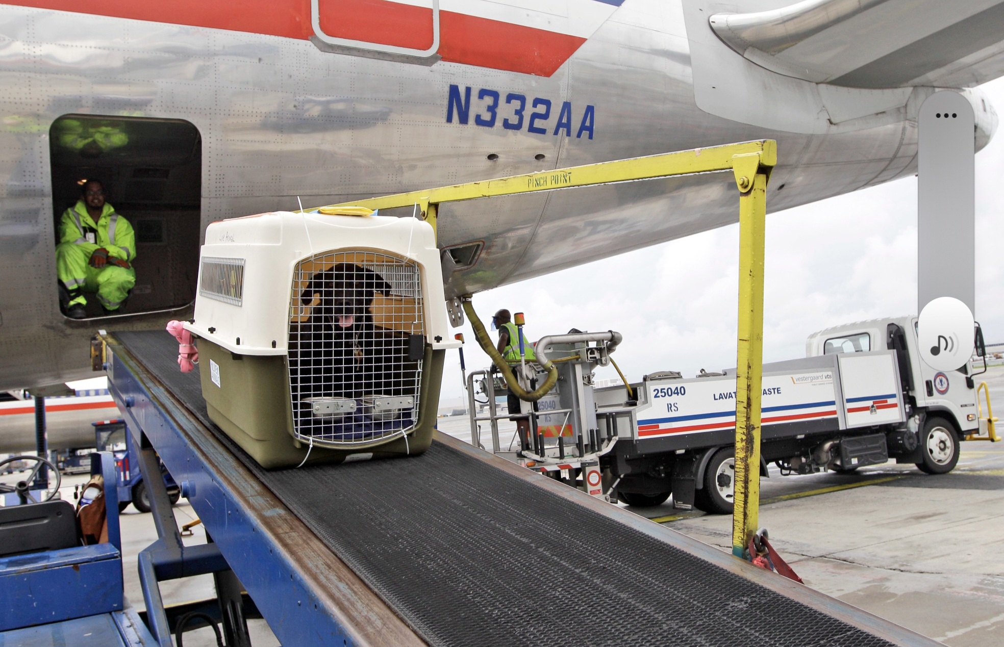 항공사 화물 운반원들이 동물 운반함 하나를 조심스럽게 내려놓았다.