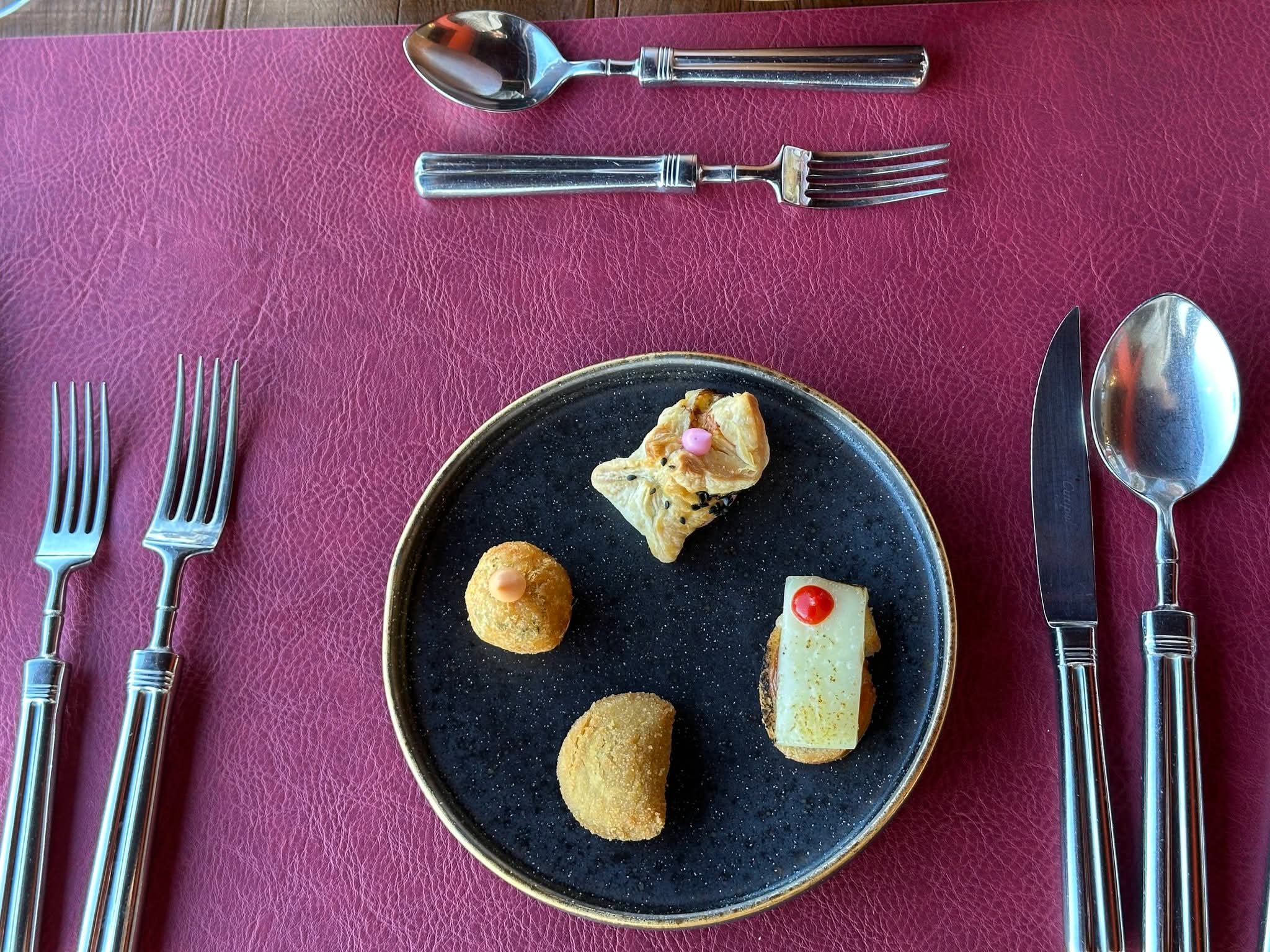 잠시 후, 작은 접시 하나가 식탁 위에 놓였다. 셰프가 건네는 네 가지 작은 아뮤즈부슈(Amuse-bouche), '사우다송 드 셰프(Saudações Do Chef)'로 입맛을 깨운다. 작은 크로켓과 치즈, 그리고 포르투갈식 페이스트리의 바삭한 텍스처와 고소한 풍미가 입안에서 가볍게 풀어지며 첫 잔의 화이트 와인(Portal Moscatel Galego Branco)이 따라졌다.
