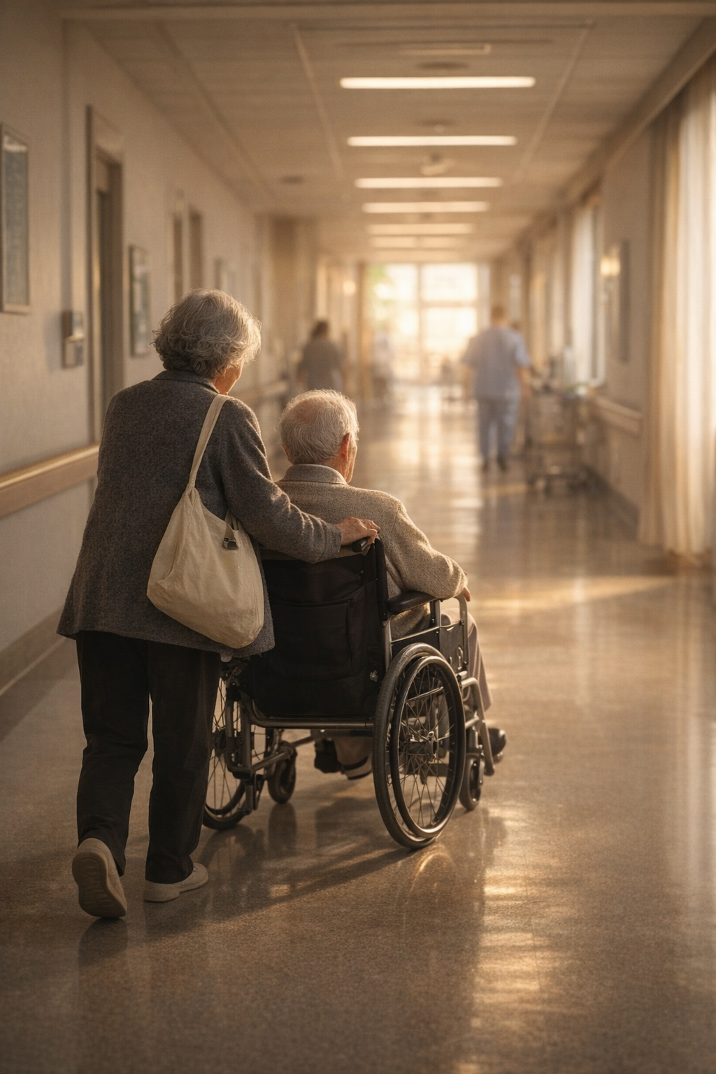 80세의 할머니가 86세의 할아버지를 휠체어에 태우고 병원 복도를 가로지르는 모습, 외출 한 번 마음 편히 못 한 채 병석의 남편 곁을 지키는 아내의 고단함.