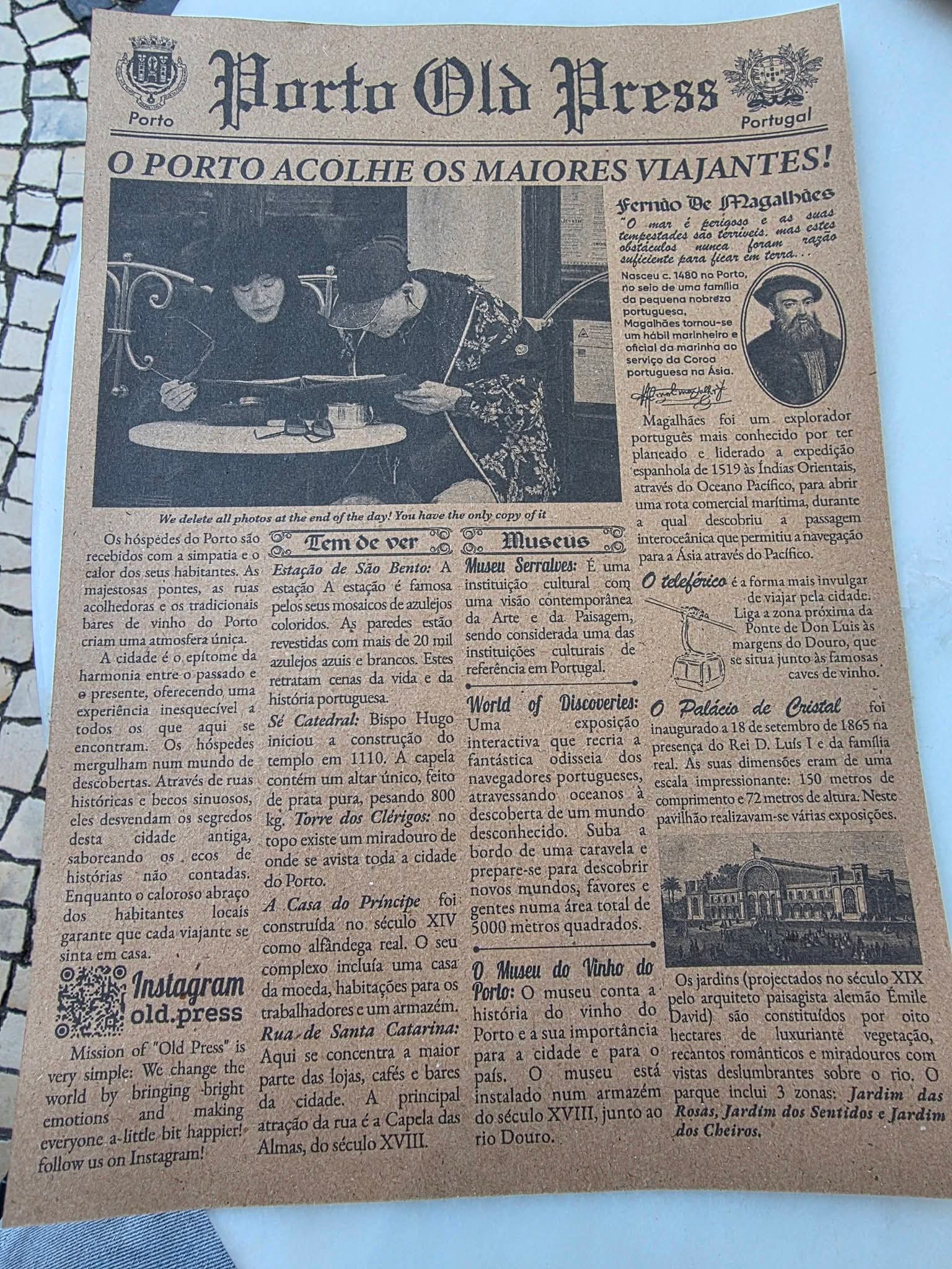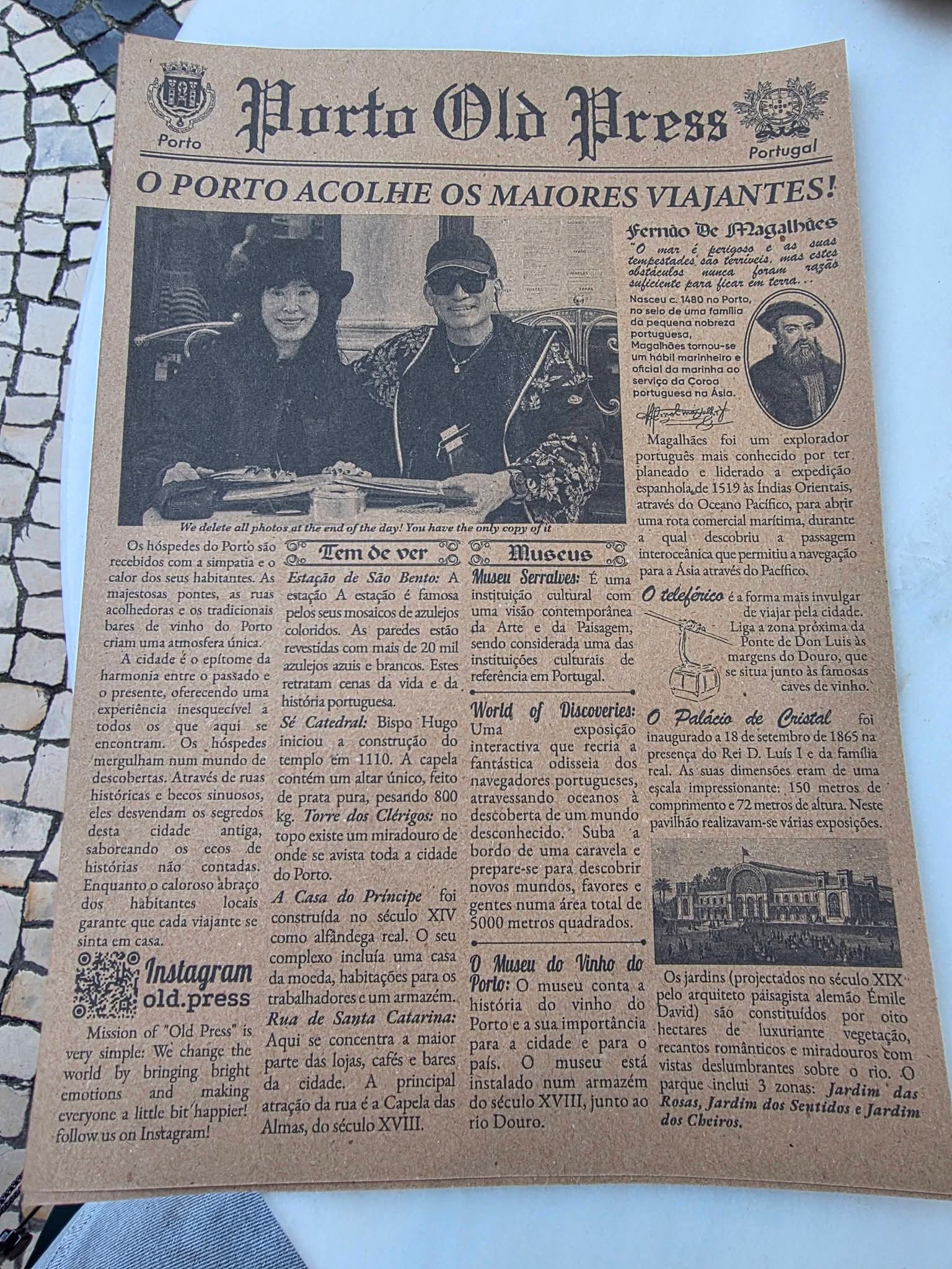카페 앞에 있는 젊은 여자가 사진을 찍더니, 포르투갈의 1920년대 스타일 옛날 신문에 마치 우리가 나온 것처럼 찍힌 페이퍼를 건넨다. 포르투갈의 또 다른 명물인 레트로 스트릿 포토그래프라고 하는데, 역사적인 카페 앞에 앉아 이런 신문(Porto Old Press)을 받아보는 것도 나름 재미가 있다.