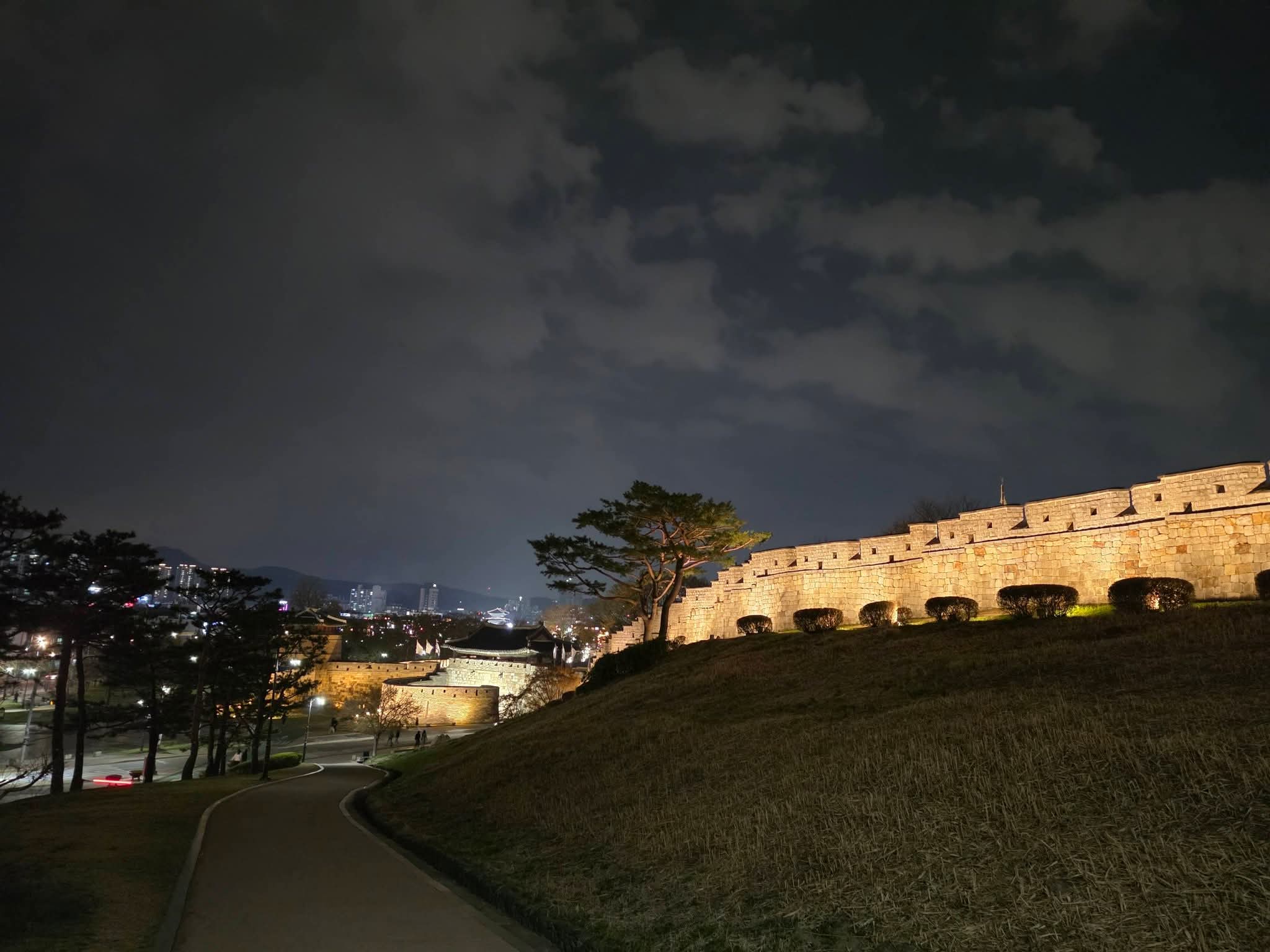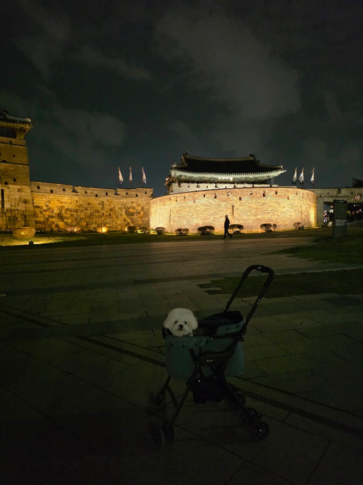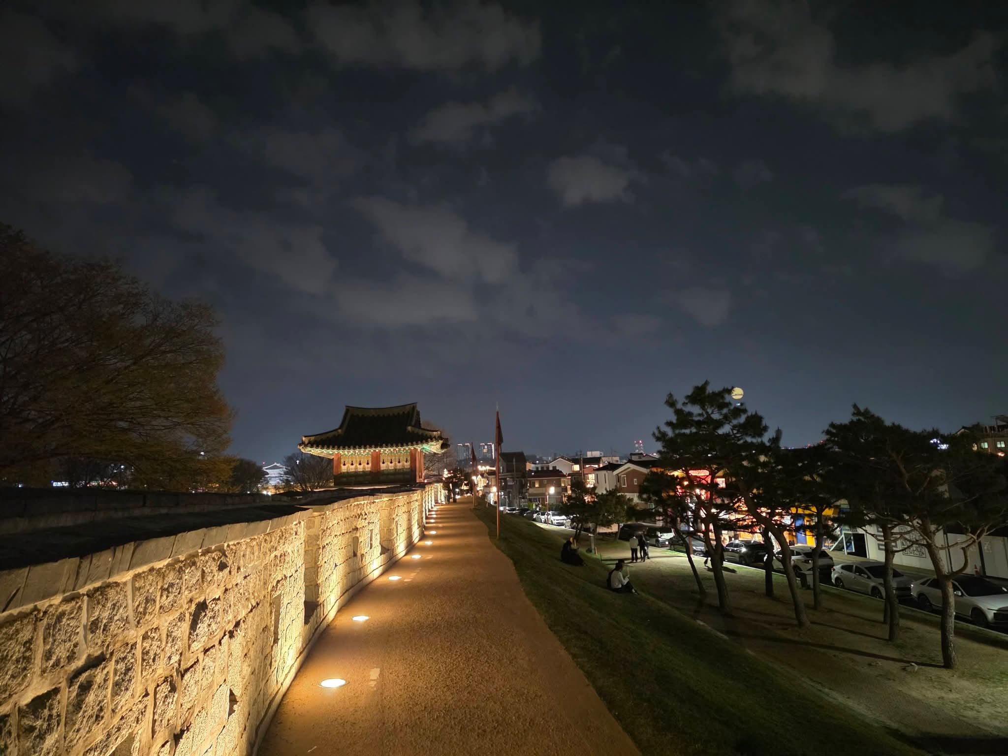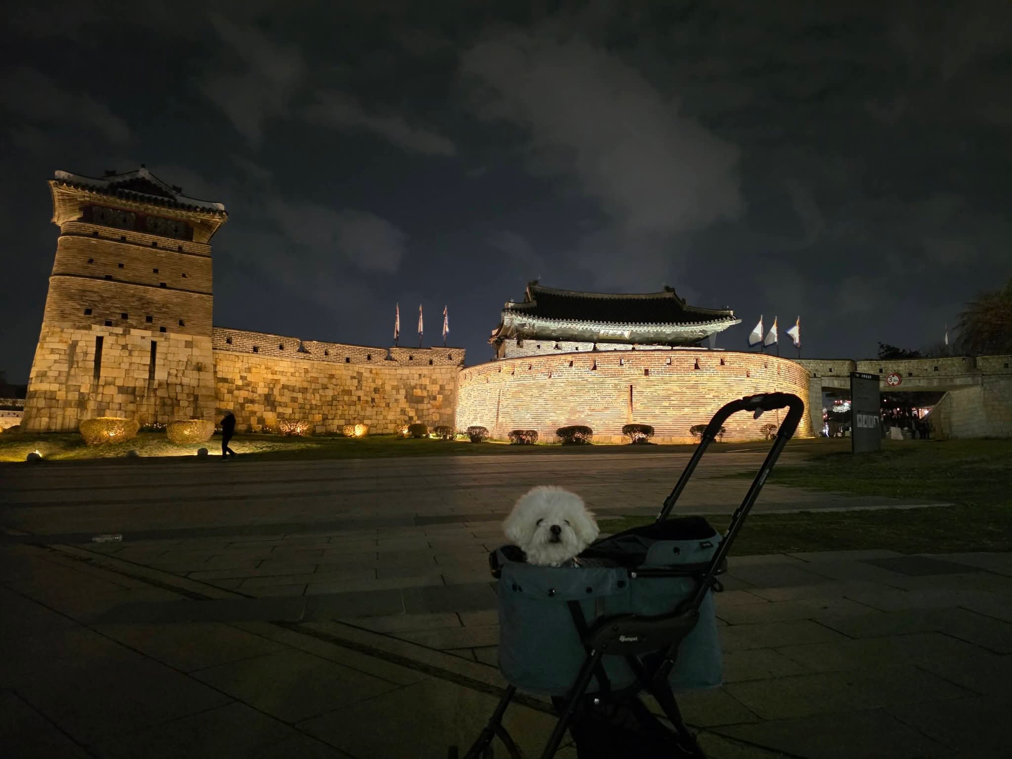 어둠이 내려앉은 수원 화성, 그 오래된 성곽길을 또르와 함께 걷는 밤은 마치 시간이 멈춘 듯 평화롭다.