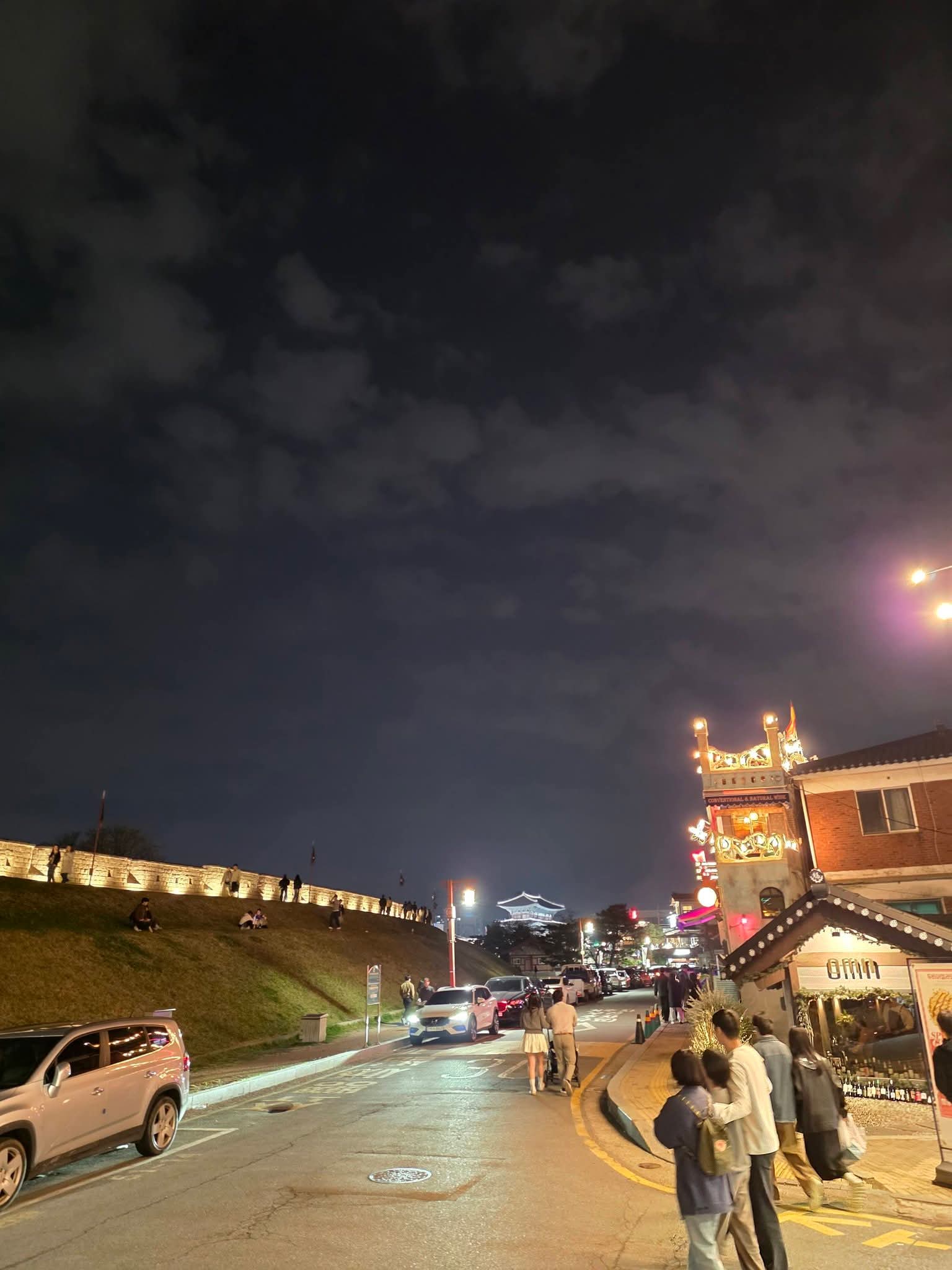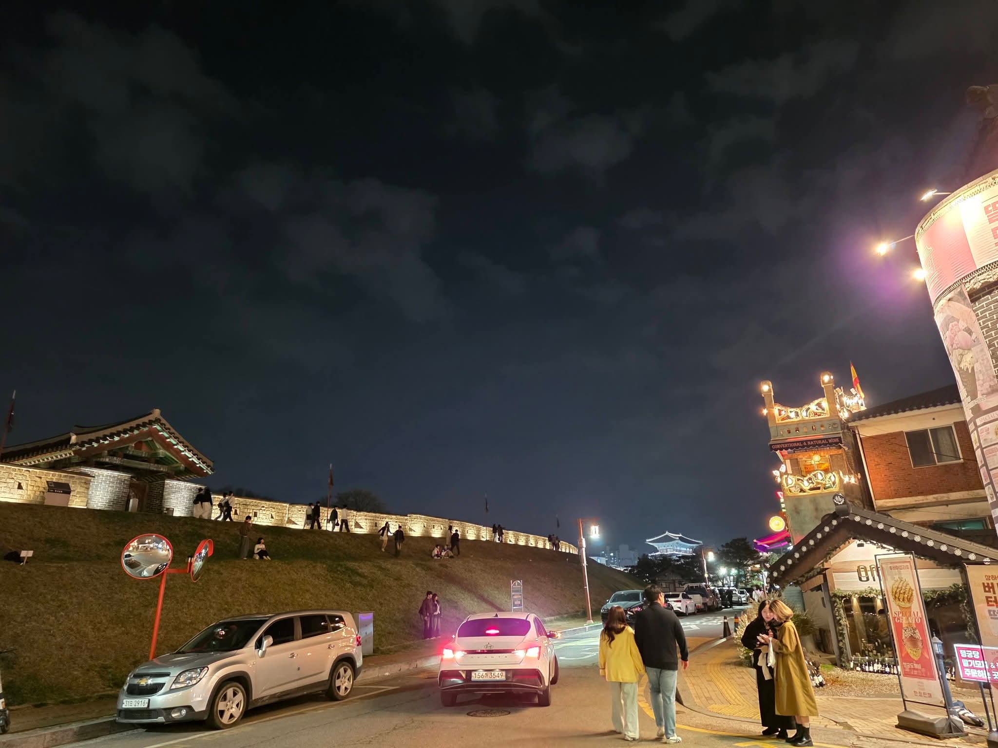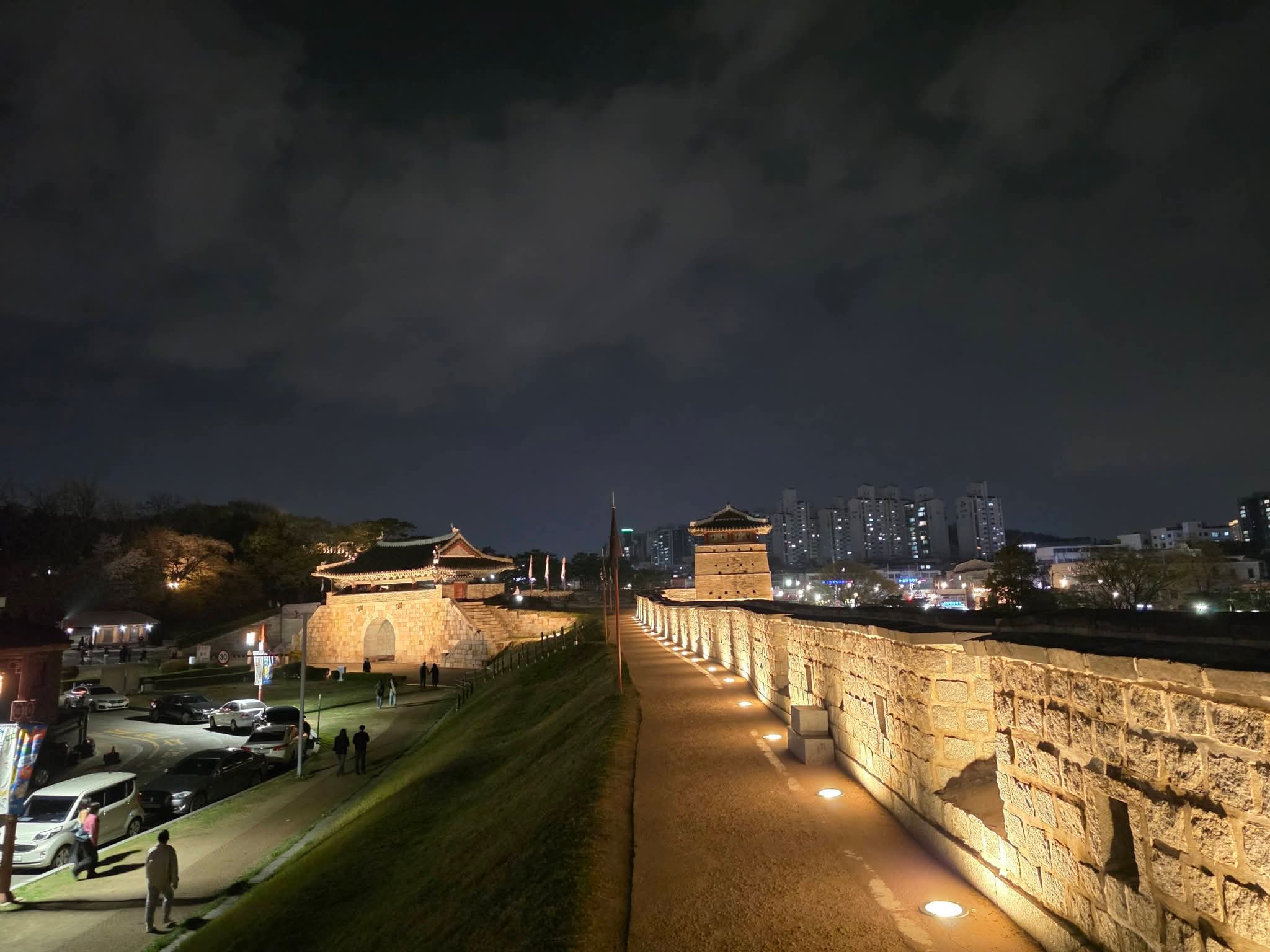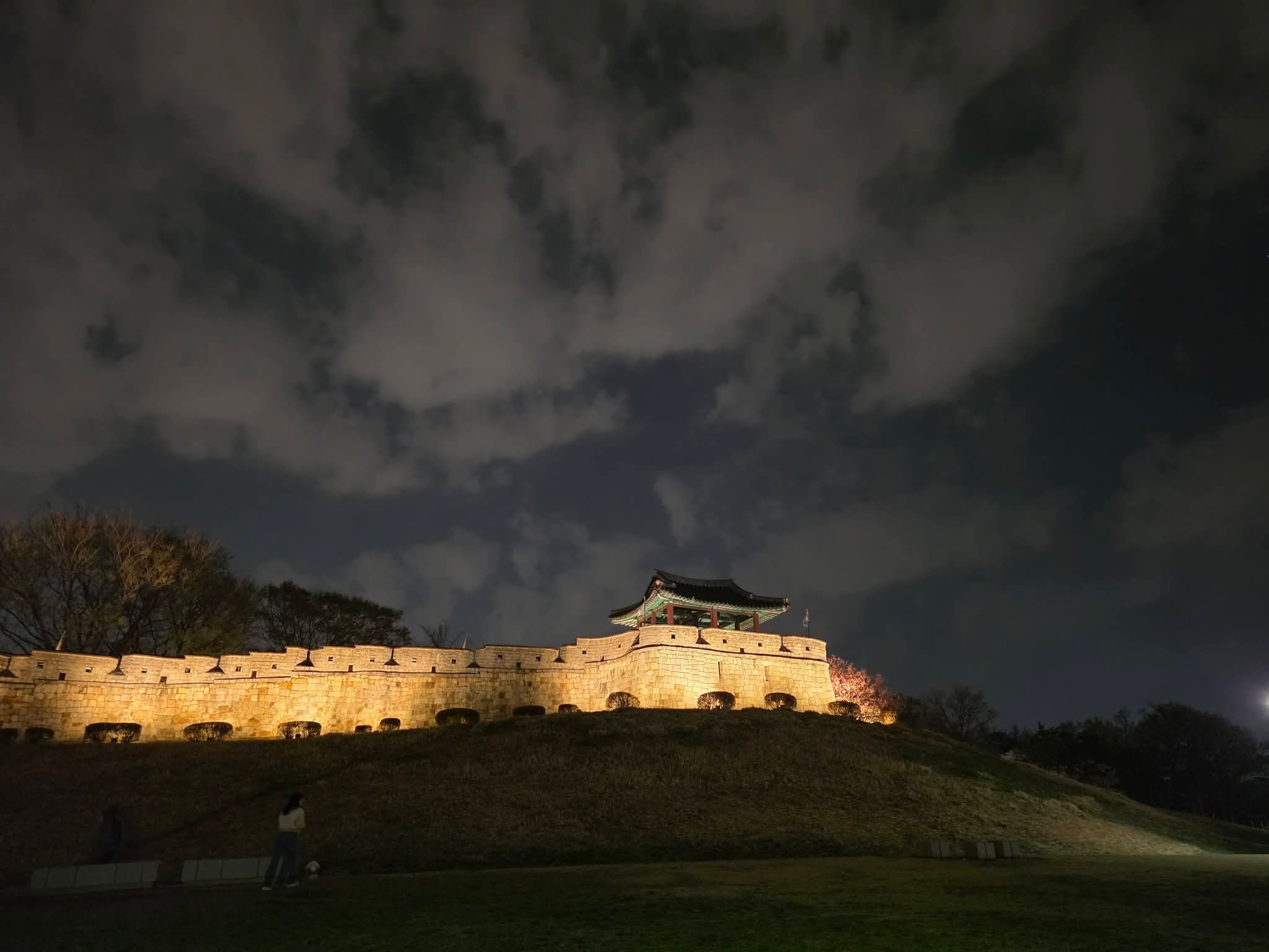 어둠이 내려앉은 수원 화성, 그 오래된 성곽길을 또르와 함께 걷는 밤은 마치 시간이 멈춘 듯 평화롭다.
