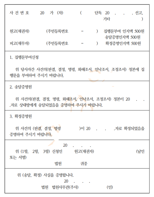 화해권고결정, 조정을 갈음하는 결정, 소송비용액확정결정 등 확정되어야 집행력이 있는 집행권원의 경우에는 확정증명서까지 함께 제출하는 것이 일반적인 실무례이다.