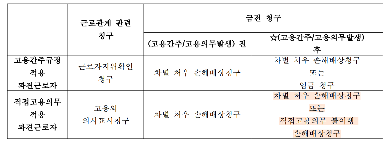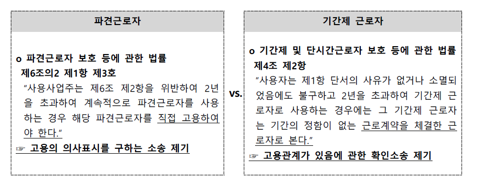 ⑵ 파견직 근로자는 고용의 의사표시를 구하는 청구를, 기간제 근로자는 고용관계 확인청구를 하여야 한다.