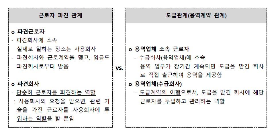 ⑴ 파견법상 파견은, 파견사업주가 근로자를 고용한 후 그 고용관계를 유지하면서 근로자파견계약의 내용에 따라 사용사업주의 지휘·명령을 받아 사용사업주를 위한 근로에 종사하 하는 것인데(제2조 제1호), 이는 이른바 (노무)도급 관계와의 구분이 용이하지 않음